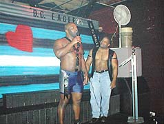 Saturday evening after contestant interviews were held. The contest got underway. Ken Snowden , a favorite at the Eagle, emceed the evenings event. Six contestants were vying for the Mr., DC Eagle title. Robert Keys, Herb Kaylor, Jason Hendrix, Ed Moore, Emanuel Nixon, and one contestant who went by the name of "Hairy Butt" (it was'nt).