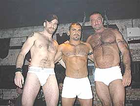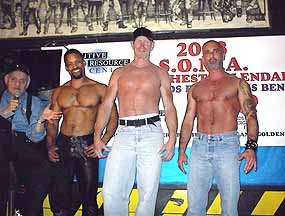 ![]() Mr SF Leather Peter Jackson (center) 1st ru Scott Brogan (lft) 2nd ru Adam Heller (rght) | ![]() SF Bare Chest Calendar contestants Corey Caballero (rght) won |